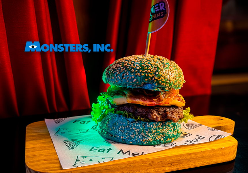 Pão Blue Monster C/ Gergelim, 250g Blend Bovino, Queijo Coalho, Bacon, Cebola Caramelizada, Alface, Tomate