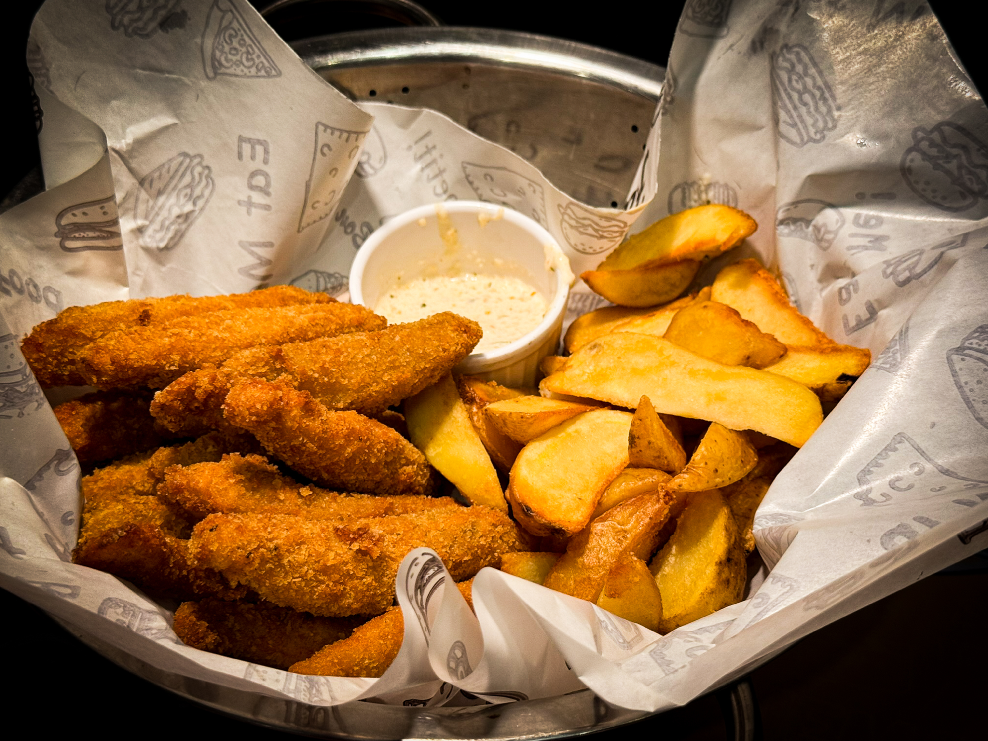 400g De Tiras De Peixe Empanado, Batata Rustica, Acompanha Molho Tartaro