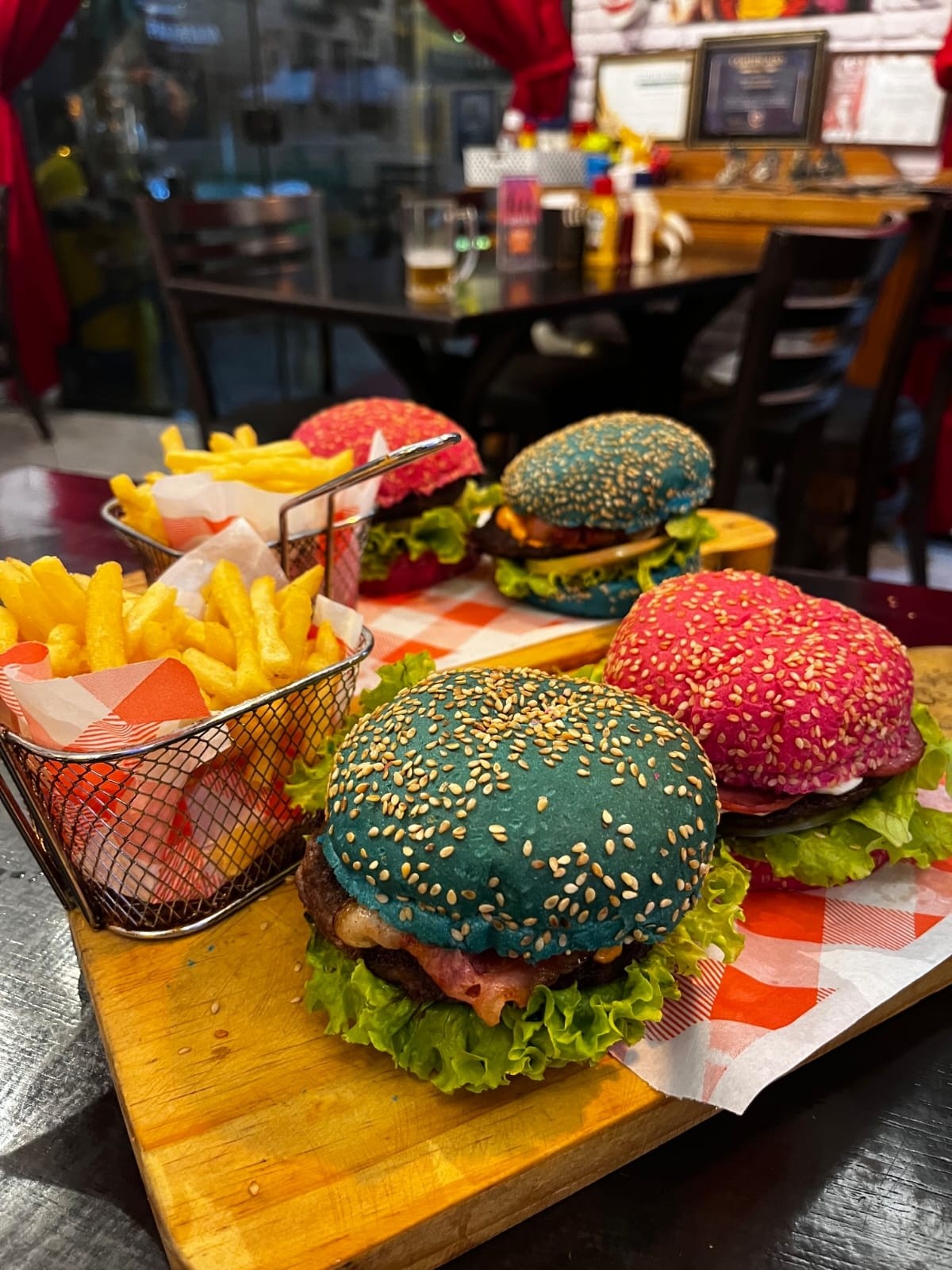 Acompanha Fritas E Maionese Caseira, 4 Burger 70g, 2 Azuis C/ Gergelim Molho Da Casa Mussarela Alface E Tomate, 2 Vermelhos Cream Cheese Farofa De Bacon Alface E Tomate, Copo Colecionável Ed Limitada