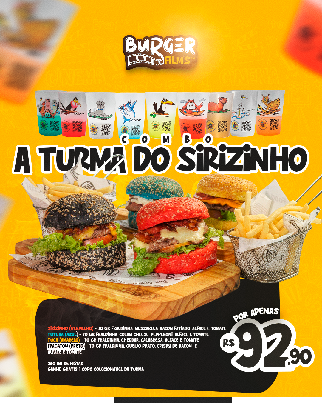 Pão Vermelho C/ Gergelim 70gr Fraldinha Mussarela Bacon Fatiado Alface e Tomate, Pão Azul C/ Gergelim 70gr Fraldinha Cream Cheese Pepperoni Alface e Tomate, Pão Amarelo C/ Gergelim 70gr Fraldinha Cheddar Calabresa Alface e Tomate, Pão Preto C/ Gergelim 70gr Fraldinha Queijo Prato Crispy de Bacon Alface e Tomate, 260g de Fritas, Copo Colecionável da turma do Sirizinho