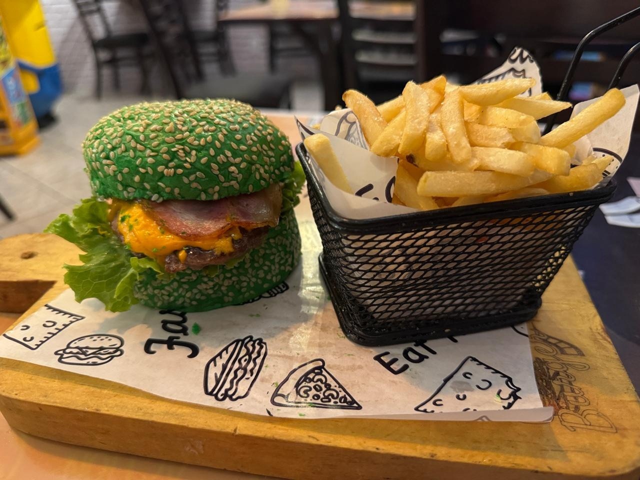 Pão Verde C/ Gergelim, 70 Gr blend de fraldinha artesanal, Cheddar, Bacon, Alface, Tomate, Acompanha 130g De Fritas